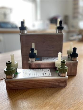 Effektiv og prisbillig pladekøler til 20-30 liter urt. Inkl. koblinger i rustfrit stål til både vand og urt.
