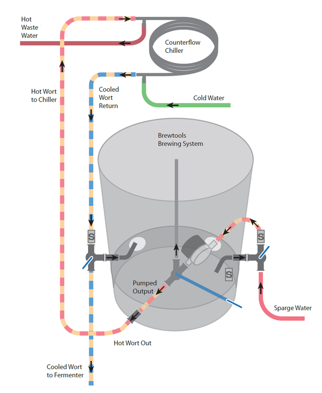 Pakken indeholder Brewtools effektive modstrømsafkøler, en ekstra 3-vejsventil, der gør det muligt at vælge, om du returnerer den afkølede urt til tanken, og dermed skaber mulighed for whirlpool eller en pumpe direkte til fermentoren/Gærtanken.