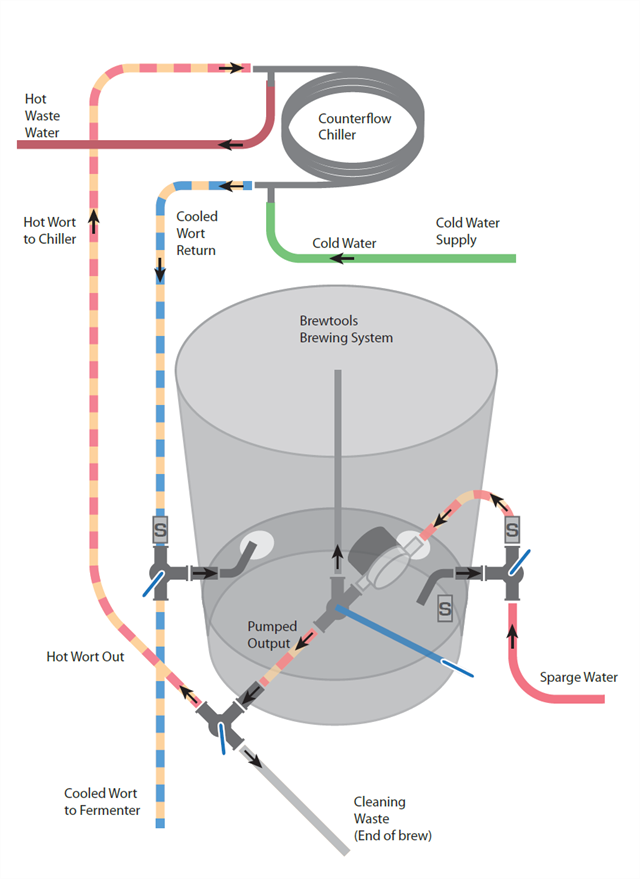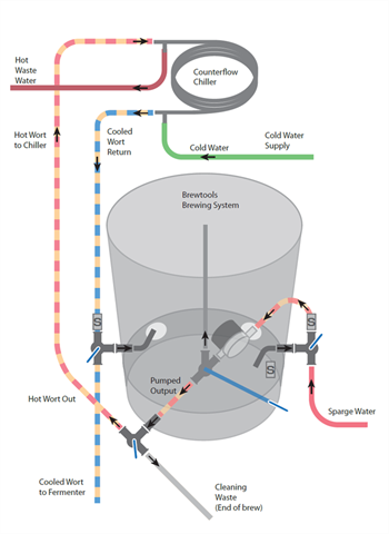 Pakken inkluderer Brewtools effektive modstrømsafkøler, tre ekstra 3-vejs ventiler, der gør dig i stand til at vælge, om du returnerer den afkølede urt til gryden og herefter lave en whirlpool (for klaring) eller at pumpe direkte til gærtanken, uden om modstrømskøleren. Endvidere slipper du for at frakoble ventiler under rengøring. (Ikke uvæsentligt!)