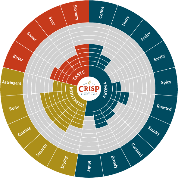 Unik ristet malt, der besidder en mild kaffelignende aroma og en dyb brun nuance.