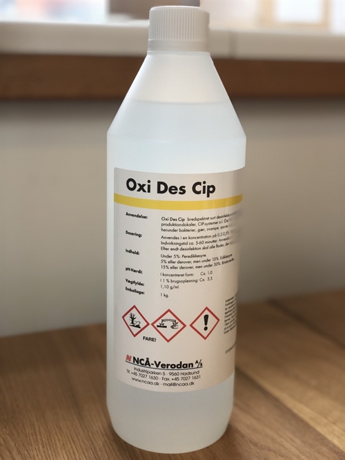 OxiDes CIP er et stærkt surt bredspektret desinfektionsmiddel som bla. er baseret på hydrogenperoxide og tilsat peeddikesyre.